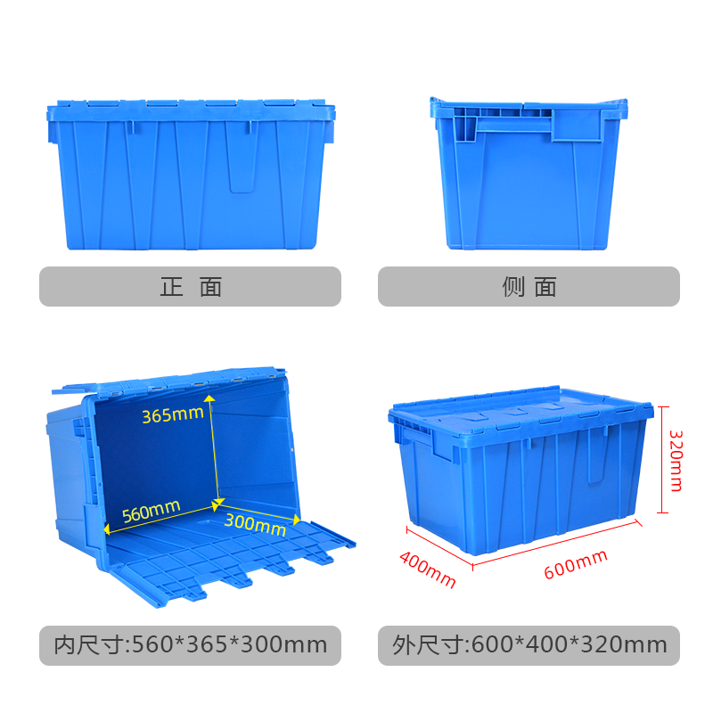 特點:全新料生產,有韌性,壽命長,開蓋可套疊,關蓋可堆碼,節省空間,降低物流成本